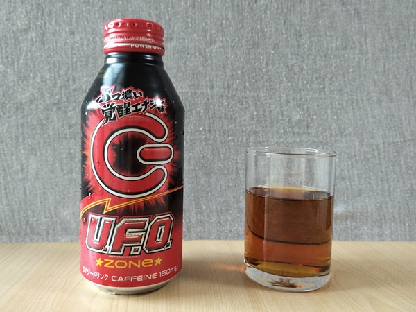 一般的なエナジードリンクはビタミンが含まれているため、多くが黄色いものをよく見かけます。しかしこのドリンクはU.F.O.とコラボしているということで茶色をしていました。はた目にみると、麦茶にしか見えません。そんなわけで、U.F.O. ZONe ENERGYを飲んでみることに。